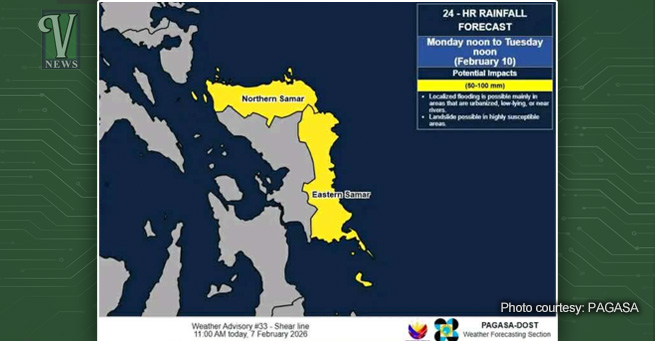 Tacloban City, Leyte — The Philippine Atmospheric, Geophysical, and Astronomical Services Administration (PAGASA) has issued a warning for heavy rainfall in Northern Samar and Eastern Samar as of February 7, 2026, at 11 a.m.